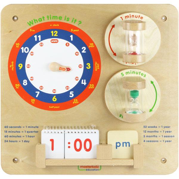 The clock at the centre of the Time Learning Board has hands that can be turned to show any time of day but as you move the second hand the hour hand moves as a normal clock. In this way the time appears correctly. A flip book can be used to confirm the time or to set a challenge “can you show 3 o’clock” for example? For more advanced children, there is a separate block depicting am and pm too. Two sand timers can be flipped on the board to visually show the passage of 1 minute and 3 minutes too.