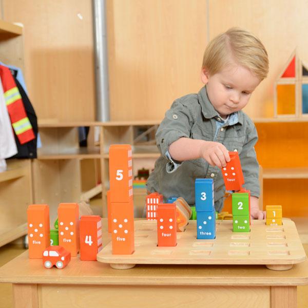 The Tiny City set comprises of blocks representing buildings, trees and cars. They are accompanied by a baseboard which has a regular hole pattern grid on its surface so that pieces can be arranged at set distances apart, forming streets and roadways. Building blocks are colour-coded too so they are easily identified and underneath they are keyed, so they fit together in a particular way. They are clearly marked with numbers and dots too and they are ‘size-proportional’ with a yellow building being the smallest 1-unit block – and red being a 4-unit block. There are so many uses for this set, with counting, observation and fine motor development at the heart of all activities, but there are also many more things to do which are explained within the excellent pictorial user guide; for example, making a sequence, according to height, stacking different buildings to make the same ‘pre-set-height’. Making a city where cars can pass between the buildings and of course free play too are all possible. With so many pieces and opportunities, setting and solving ever more complex tasks are also possible with this set. A fun resource, with highly focused challenges which will help children with their understanding of size, proportion, spatial-awareness and logic.