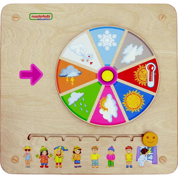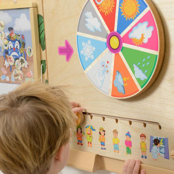Every day the weather is different and this will affect what we wear. This is an interactive weather learning wall element encourages children to learn and identify different weather conditions. When a weather condition is chosen by rotating the weather wheel, children will be asked about what to wear under that weather condition. Adults will provide comments if children are not making the right "What to Wear" choices. Other children join the discussion, too. A a very good interactive learning process for children to learn about weather and self-caring.