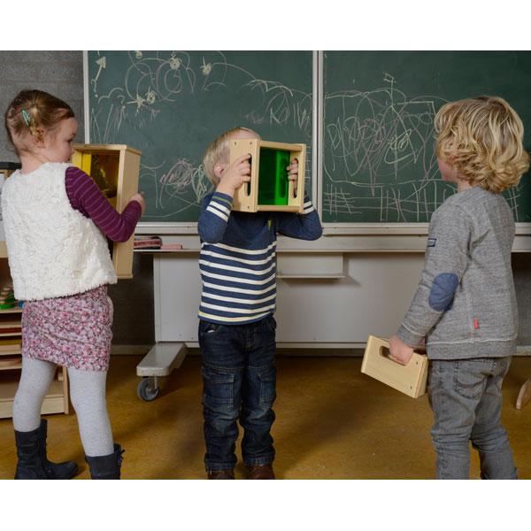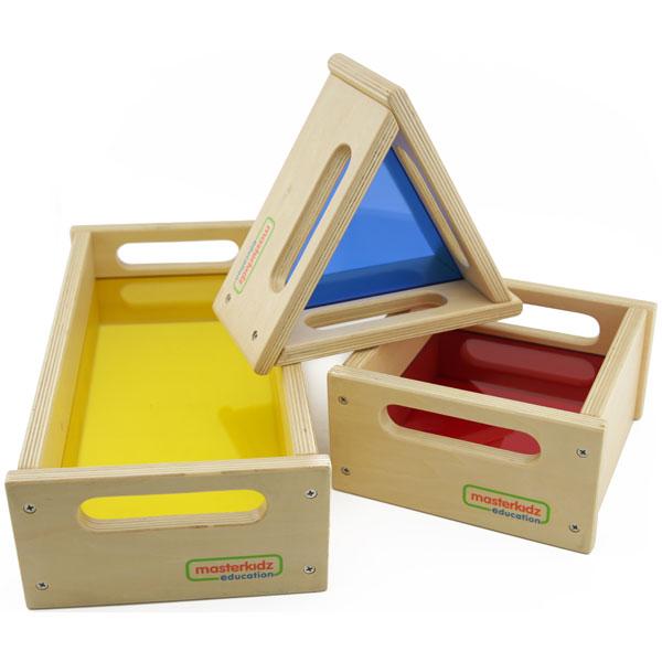 A set of 3 giant wooden blocks with double-sided coloured acrylic inserts. This set can be used in conjunction with the Hollow Blocks set and can be looked through to provide children with a different perspective of the world. Set of 3 shapes in 3 assorted colours.